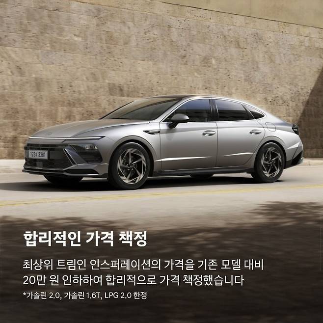 이 외에도 매뉴얼 A/C 애프터 블로우 기능을 적용시켜 보다 쾌적한 실내 환경을 조성할 수 있게 되었습니다. 여기에 탑승자 안전 확보를 위한 2열 프리텐셔너가 전 트림 기본 적용되어 안전사양을 강화했고 최상위 트림인 인스퍼레이션의 가격을 기존 모델 대비 20만원 인하하여 합리적으로 가격을 제공합니다. 하지만 역동성을 극대화한 쏘나타 N Line을 제외한 가솔린 2.0, 가솔린 1.6T, LPG 2.0 한정으로 20만원 인하된다는 점을 참고해야 됩니다.