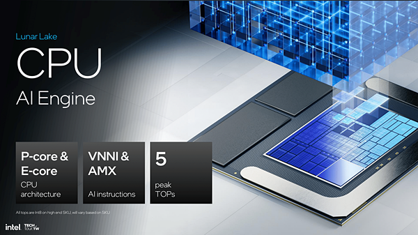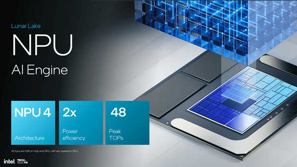 AI도 빼놓을 수 없죠. 루나레이크는 메테오레이크보다 인공지능 연산 성능이 크게 향상됩니다. 최대 48 TOPS 성능의 NPU 4 엔진은 메테오레이크의 3배에 달합니다. NPU와 CPU, GPU를 모두합친 플랫폼 전체의 성능은 최대 120 TOPS에 달한다고 주장했습니다. 이를 통해 마이크로소프트 Copilot+(코파일럿 플러스) PC 기준을 만족하고 최신 윈도우 11에서 조만간 지원할 각종 AI 기능을 쾌적하게 활용할 수 있게 될 겁니다.