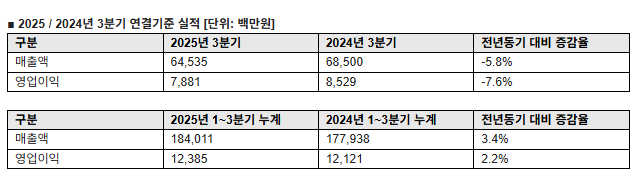 1~3분기 연결기준 누적 매출과 영업이익, 순이익은 각각 1840억원, 124억원, 288억원을 기록했다. 전년 동기 대비 각각 3.4%, 2.2%, 93.8% 늘어났다.