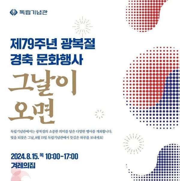 2024년 광복 79주년을 맞이해 국내 곳곳에서는 8월 15일 다양한 광복절 기념 행사가 개최되는데요. 이번 광복절 공휴일에는 휴식보다는 광복절 기념 행사를 찾아 독립의 의미와 우리 역사의 정체성을 되새기며 의미있게 보내보는 것은 어떨까요?