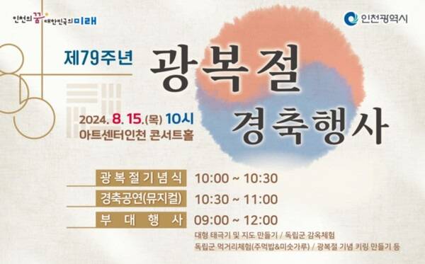 인천 아트센터 일원에서는 약 3시간동안 광복을 주제로 한 공연과 부대행사가 마련됩니다. 오전 10시 30분부터 진행되는 뮤지컬 공연은 광복을 주제로 한 창작뮤지컬 '해방의 그날'로, 행사의 시작을 웅장한 음악이 곁들여진 공연으로 광복의 의미를 한층 더 깊게 이해할 수 있습니다.