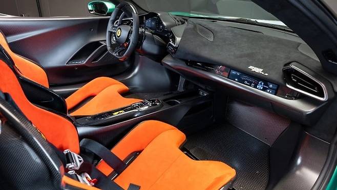 주행의 스릴을 극대화하기 위해 경량화에도 심혈을 기울였습니다. 차체 일부에 탄소 섬유를 사용하고 엔진 구성품에는 티타늄과 같은 소재를 적용하여 296 GTB 대비 총 60kg의 무게를 감량했습니다. 그 결과, 중량 대비 출력비는 단 1.60kg/cv에 불과하며, 이는 후륜구동 페라리 베를리네타 모델 중 최고 수준입니다.