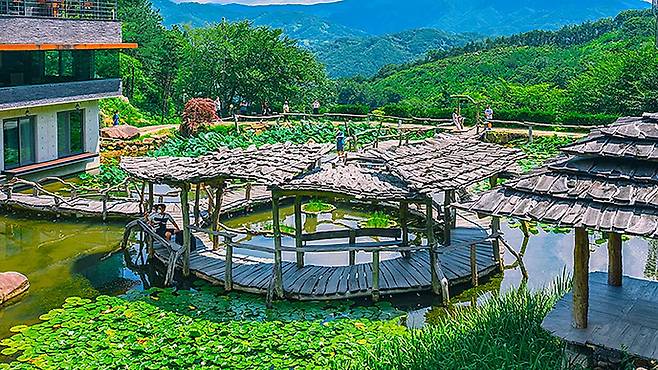 잔디밭 한쪽에는 ‘마음 심(心)’ 자 모양의 작은 연못이 숨어 있다. 소박하지만 우아하게 피어난 연꽃이 돌과 나무 사이를 수놓으며, 앞서 본 거대한 연못과는 다른 잔잔한 감동을 전한다. 자연이 선사하는 두 가지 표정이 한 공간에서 어우러지는 순간이다.