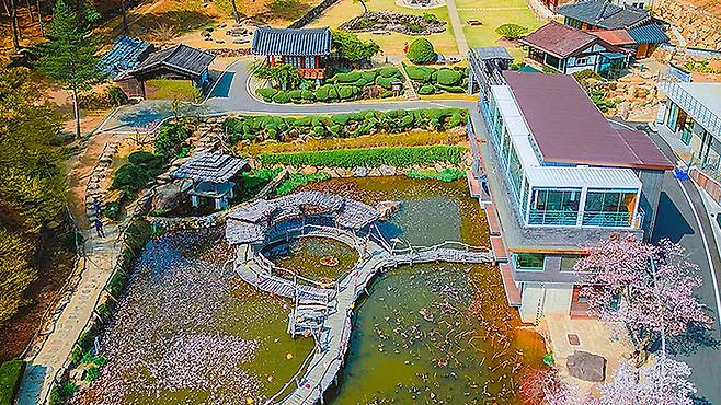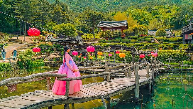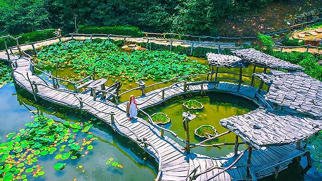 수선사의 중심에는 커다란 연못이 자리한다. 수면 위로 놓인 목조다리와 그 주변을 감싼 숲, 그리고 사찰 건물이 어우러져 마치 한 폭의 풍경화를 보는 듯하다. SNS에서 ‘산청 핫플레이스’로 불릴 만큼 인기가 높은 이유도 바로 이 장면 덕분이다.