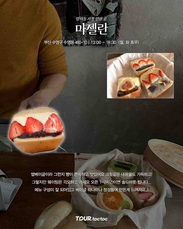 다음은 베이글 덕후라면 꼭 가야 할 ‘마젤란’. 쫀득한 식감의 빵 안에 상큼한 생과일과 달콤한 앙금, 크림이 조화롭게 어우러져있습니다. 오전 1~2시간이면 솔드아웃 되는 핫플레이스인 만큼, 웨이팅을 각오하고 일찍 가는 것이 좋습니다. 베이글마다 정성이 가득해 하나하나 고르고 먹는 재미도 쏠쏠하죠.