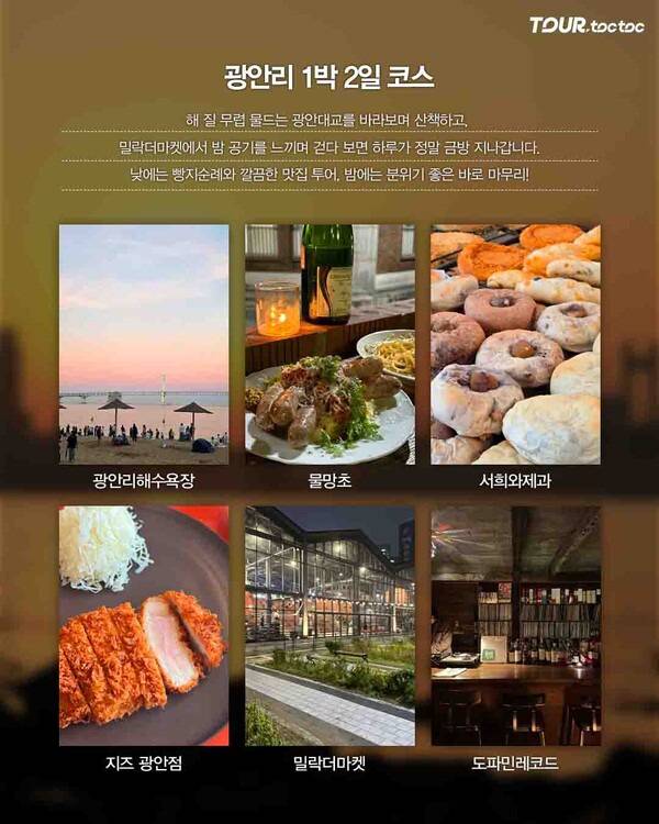 광안리여행은 낮에는 감성, 밤에는 분위기 좋은 핫플로 손꼽히는 광안리는 부산 뚜벅이 여행에서 빼놓을 수 없는 코스입니다. 해 질 무렵 광안리해수욕장에서는 광안대교를 배경으로 산책하며 무드를 즐기기 좋습니다.