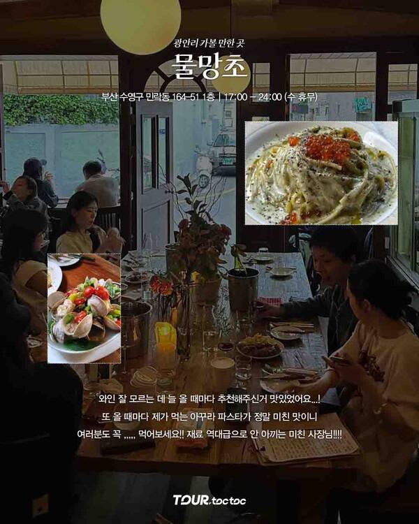 식사 장소로는 ‘물망초’를 추천합니다. 분위기 좋은 인테리어와 더불어 아꾸라 파스타 같은 시그니처 메뉴는 매번 만족을 주며, 재료를 아낌없이 사용하는 정직한 운영이 느껴집니다.
