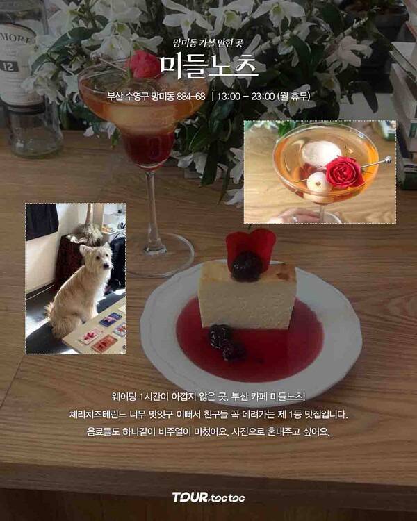 첫 번째 추천지는 감성 가득한 칵테일 카페 ‘미들노츠’. 체리치즈테린은 눈과 입을 모두 사로잡으며, 기다리는 시간이 아깝지 않을 만큼 만족도가 높습니다. 음료 하나하나에도 디테일이 살아 있어, 비주얼이 미쳤다는 평을 받을 정도로 사진 찍기에도 완벽합니다.