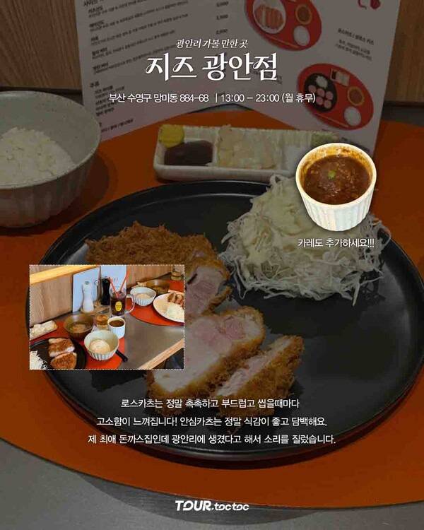 광안리 돈카츠 맛집으로는 ‘지즈 광안점’이 인기입니다. 로스카츠의 촉촉함과 부드러운 식감은 물론, 고소한 풍미가 살아 있어 만족도가 높은 곳입니다. 특히 안심카츠도 쫄깃하고 두툼해 누구와 가도 호불호 없이 즐길 수 있습니다.