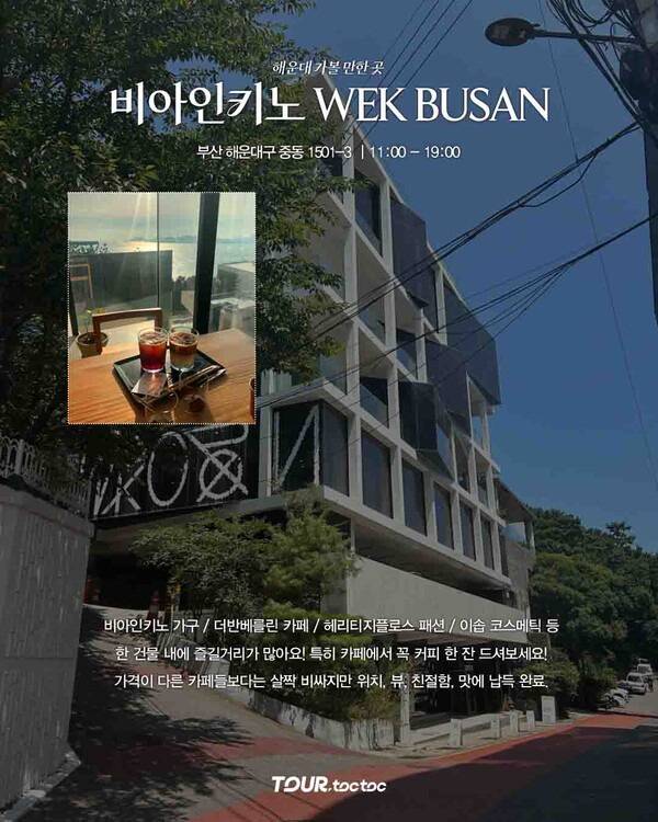 카페를 찾는다면 ‘비아인키노 WEK BUSAN’을 추천합니다. 이곳은 더반베를린 카페, 가구 매장, 코스메틱 등 다양한 복합문화 공간이 함께 있는 복합건물이며, 바다 전망과 분위기, 커피 맛까지 모두 완벽한 곳입니다. 가격대는 다소 높지만 그만한 가치가 있다는 평가를 받고 있습니다.