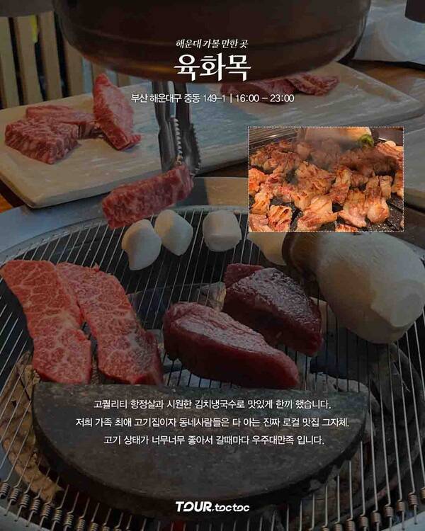 맛집으로는 ‘육화목’이 현지인들 사이에서도 유명한 고깃집입니다. 항정살과 김치냉국수를 함께 즐길 수 있으며, 고기 질도 훌륭해 갈 때마다 만족도가 높습니다. 고기 상태가 뛰어나 갈 때마다 우주대만족이라는 표현이 나올 정도입니다.