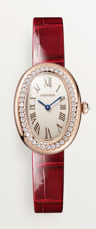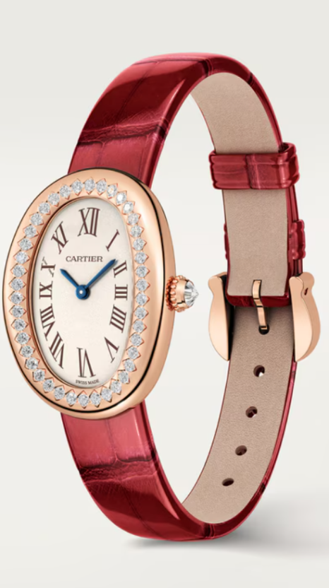 핑크 골드 케이스에 브릴리언트 컷 다이아몬드 42개가 세팅되어 있어 눈부신 아름다움을 자랑하죠. 또한, 악어가죽 스트랩은 피노 누아 와인을 연상시키는 붉은 빛으로