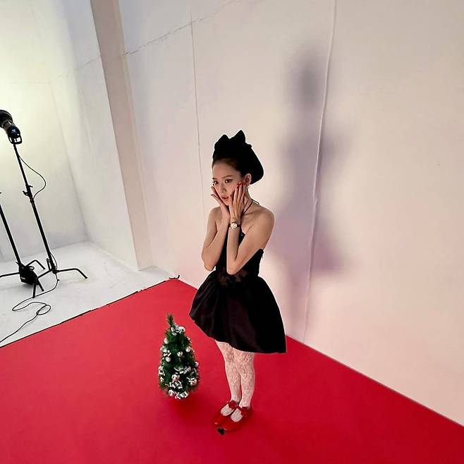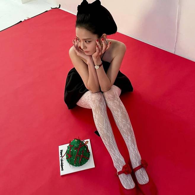 블랙핑크 지수는 크리스마스의 설렘을 그대로 옮겨 놓은 듯합니다. 화사한 레드와 대비되는 올블랙의 심플한 드레스, 거기에 더해진 레이스 타이츠와 리본 플랫 슈즈 코디!
