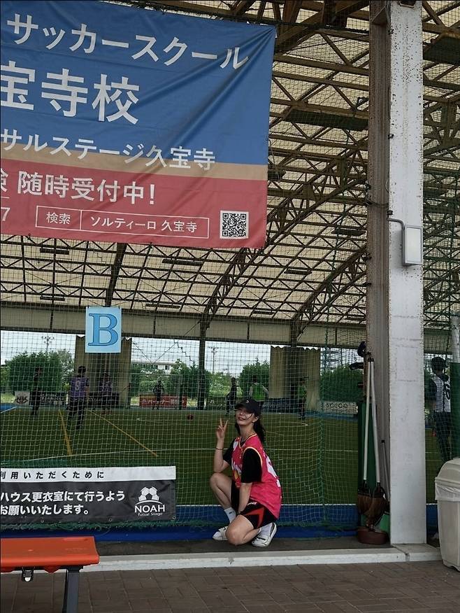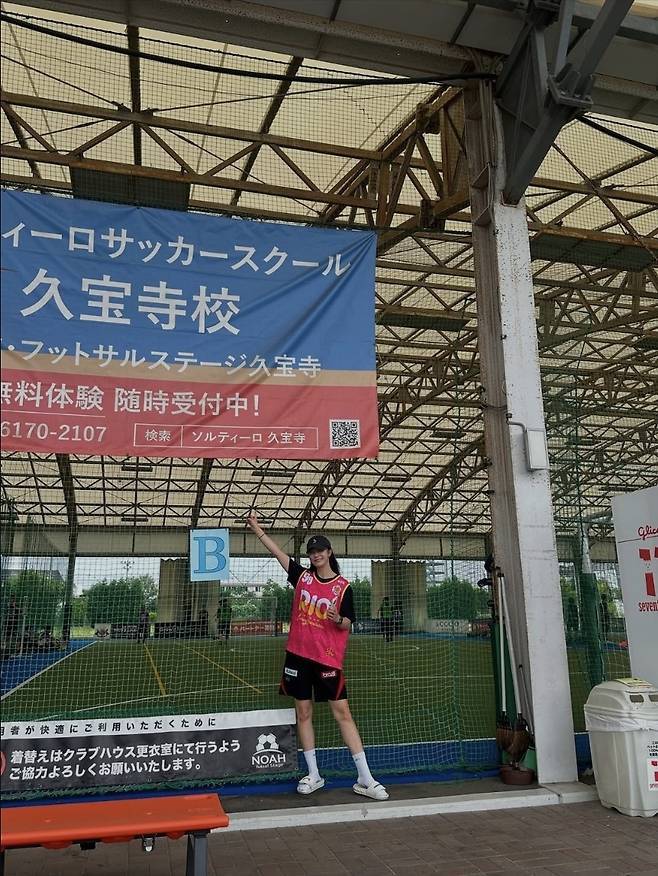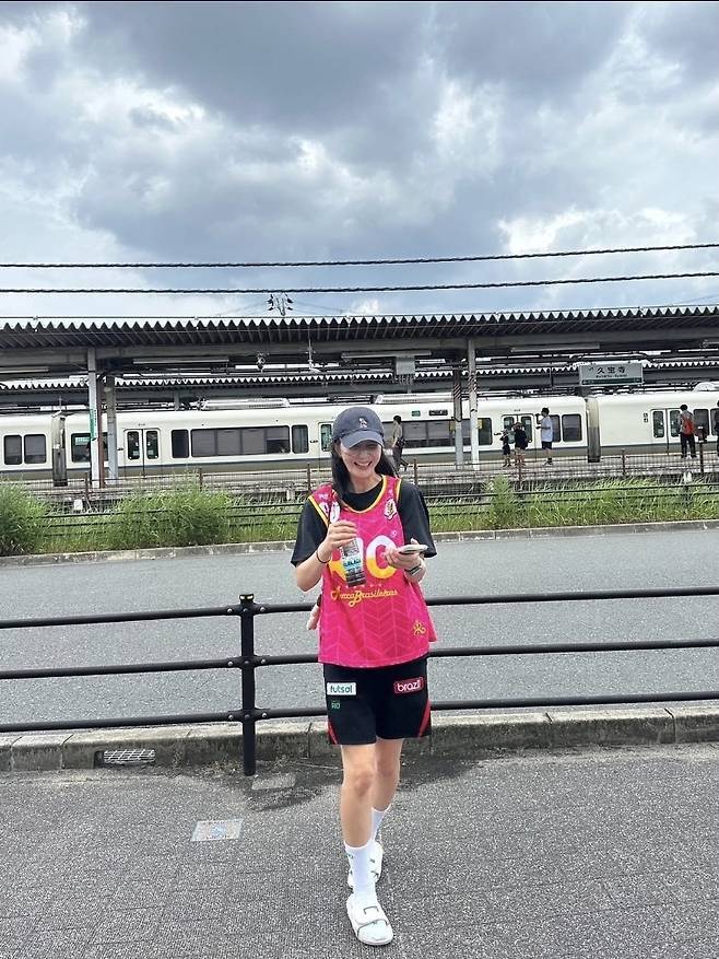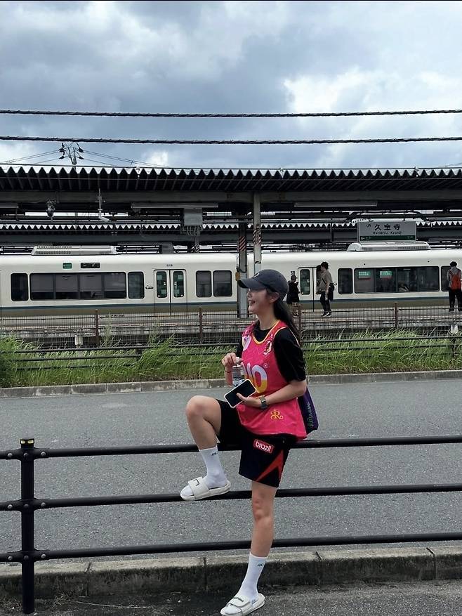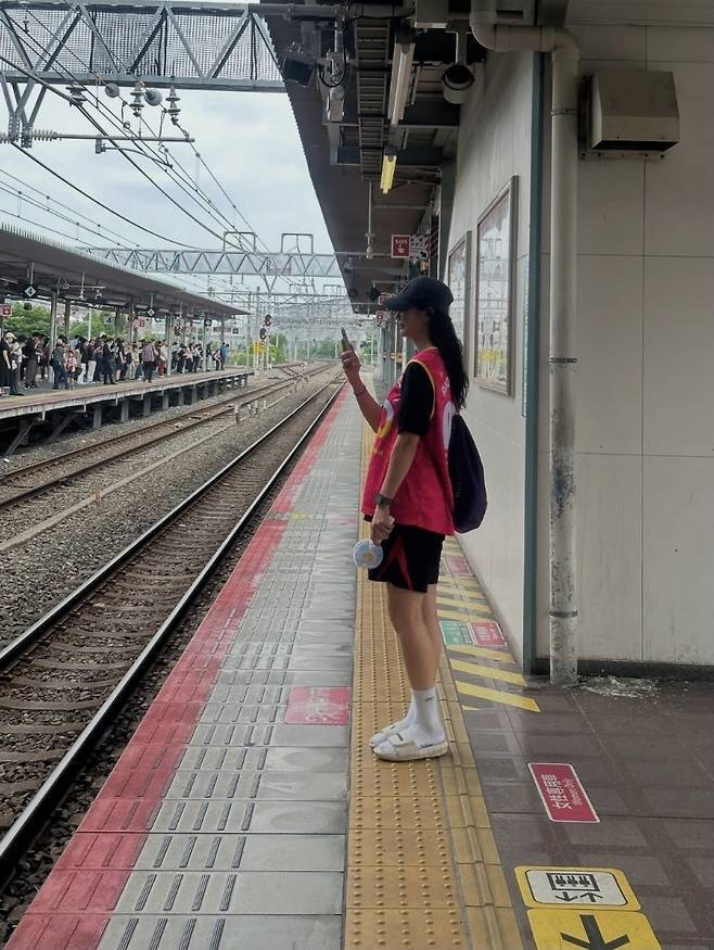 핫핑크 농구 저지에 블랙 쇼츠, 볼캡과 양말, 스니커즈까지 더한 스타일은 Y2K 힙합 감성 가득한 룩으로 재탄생했습니다.
