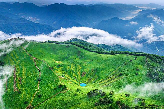연둣빛으로 물든 능선과 시원한 숲길, 그리고 산 속에 숨겨진 신비한 돌리네 연못까지