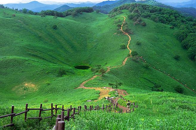 연둣빛으로 물든 능선과 시원한 숲길, 그리고 산 속에 숨겨진 신비한 돌리네 연못까지