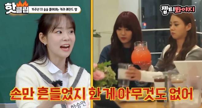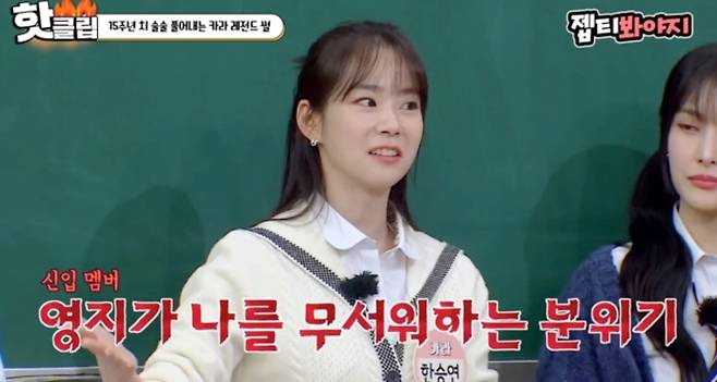 허영지는 한 장의 사진을 공개해 눈길을 끌기도 했는데요. '카라가 무서운(?) 언니들’이라는 사진 속에는 한승연 옆에서 어쩔줄 몰라하는 영지의 모습이 담겼습니다.