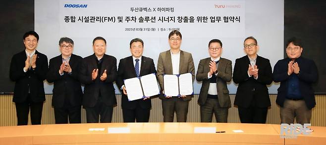 하이파킹은 지난 31일 서울시 중구 동대문 두산타워에서 두산큐벡스와 '주차장 내 시설관리 및 스마트 주차 관리시스템’ 관련 업무협약을 체결했다.