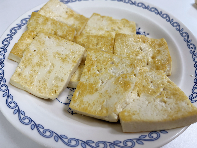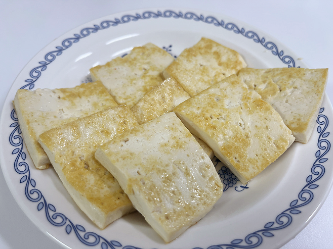 두부 구이를 할 때는 얇게 잘라 전자레인지 돌린 뒤 중 약불에 구워보세요. 겉은 쫄깃하고 안은 부드러운 식감으로 완성됩니다.