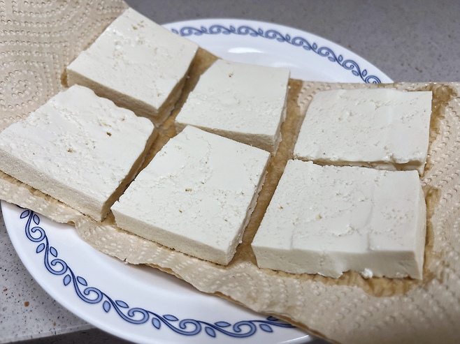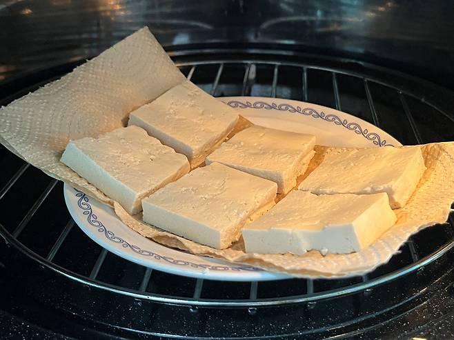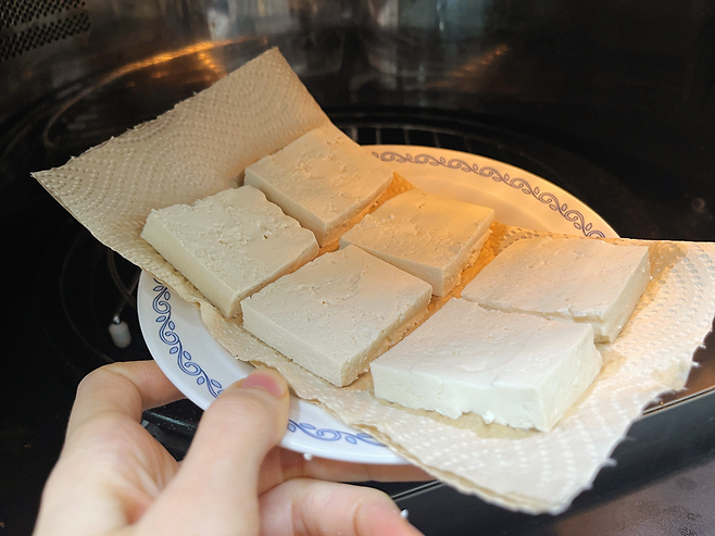 두부를 얇게 자른 후 전자레인지에 넣어 1~2분 돌리세요. 전자레인지에 두부를 돌리면 수분이 증발하면서 물기가 제거됩니다.