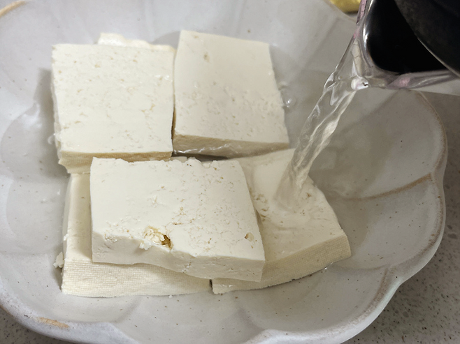 두부는 잘라서 그냥 두면 생각보다 많은 간수가 나옵니다. 특히 찌개나 조림 등의 요리를 할 때 이렇게 두부 간수를 빼는 것을 추천합니다.