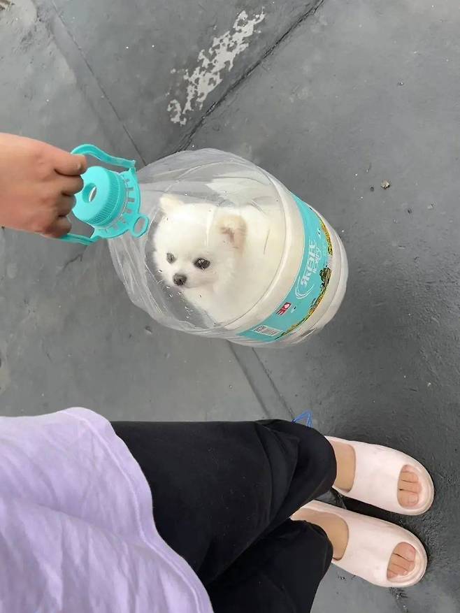 그래서 주인은 기발한 발상으로 강아지를 생수통에 담아 산책을 나섰습니다! 마치 '한 통에 담긴 강아지' 같은 모습이었어요!