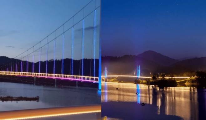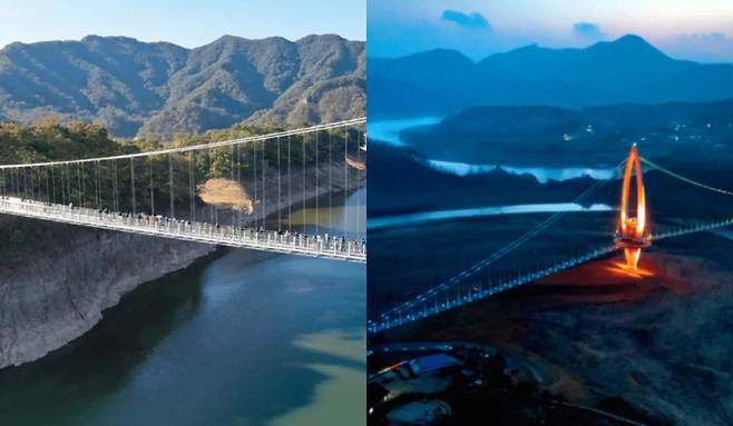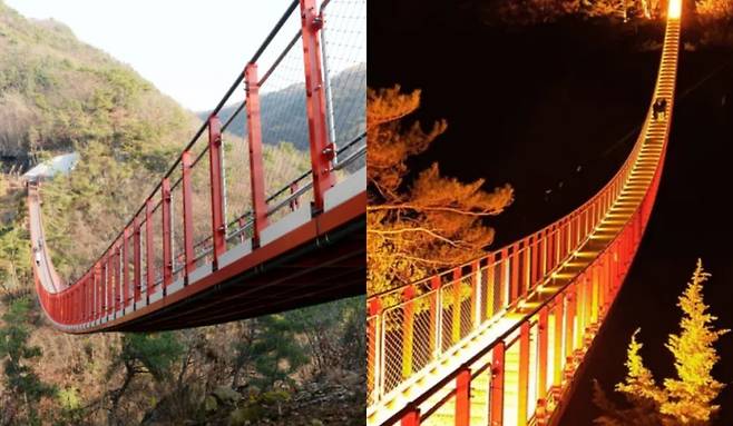 밤이 되면 분위기가 달라진다. 다리를 따라 설치된 LED 조명이 은은한 빛을 뿜어내며 환상적인 야경을 연출한다. 낮에는 자연을, 밤에는 감성을 즐길 수 있는 곳. 출렁다리 위에서 사진 한 장 찍는 순간 인생샷이 완성된다.