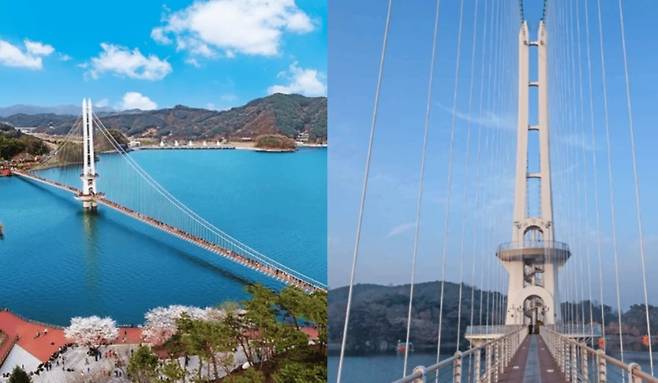 전북 임실에 자리한 옥정호 출렁다리는 420m 길이로 붕어섬과 연결되는 현수교다. 이곳에서 가장 유명한 건 벚꽃이다. 봄이 되면 출렁다리 양옆으로 벚꽃 터널이 형성되고 분홍빛 낭만이 가득한 풍경을 선사한다. 바람에 날리는 꽃잎을 맞으며 다리를 건너는 순간 마치 영화 속 주인공이 된 기분이 든다.
