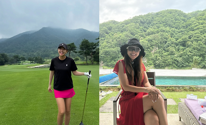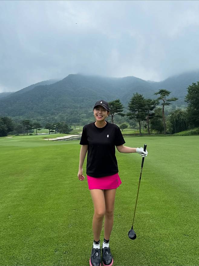 블랙 티셔츠와 핑크 미니스커트로 구성된 골프웨어를 착용하고 있다. 캡 모자로 스포티한 분위기를 더하며, 골프채를 든 자세가 액티브한 라이프스타일을 드러내고 있다. 산을 배경으로 한 그린 위에서 기능성과 패션성을 동시에 잡은 골프 룩을 선보이고 있다.