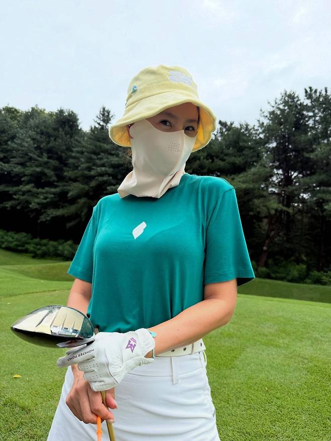 옐로우 버킷햇과 화이트 마스크를 활용한 철저한 자외선 차단 패션을 연출하고 있다. 그린 컬러 티셔츠와 화이트 팬츠의 조합으로 깔끔한 골프 룩을 완성했으며, 기능성 장갑까지 착용해 실용적인 스포츠웨어 스타일링을 보여주고 있다.