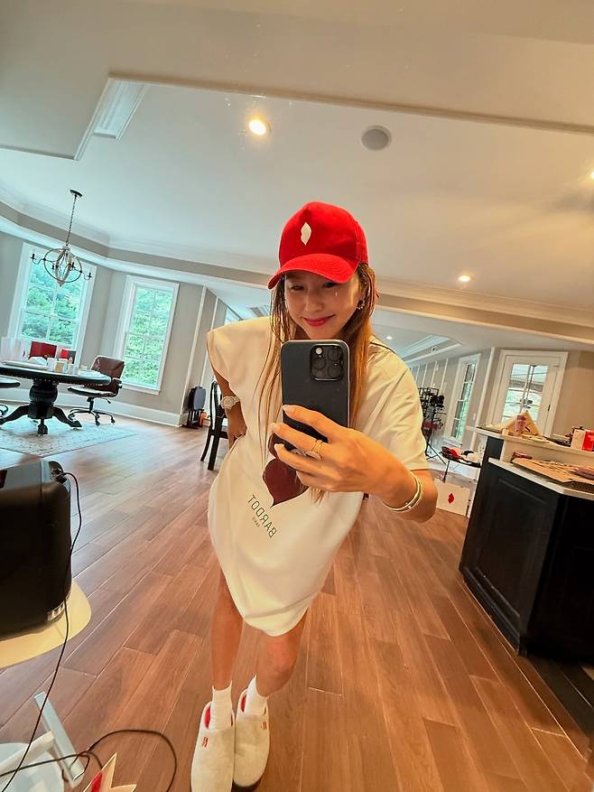 레드 캡과 크림색 오버사이즈 후드티로 편안한 홈웨어 룩을 연출하고 있다. 셀카를 찍는 자연스러운 모습으로 일상적이면서도 트렌디한 캐주얼 패션을 선보이고 있다. 컬러 포인트를 준 캡 모자가 심플한 후드티 룩에 생동감을 더하고 있다.