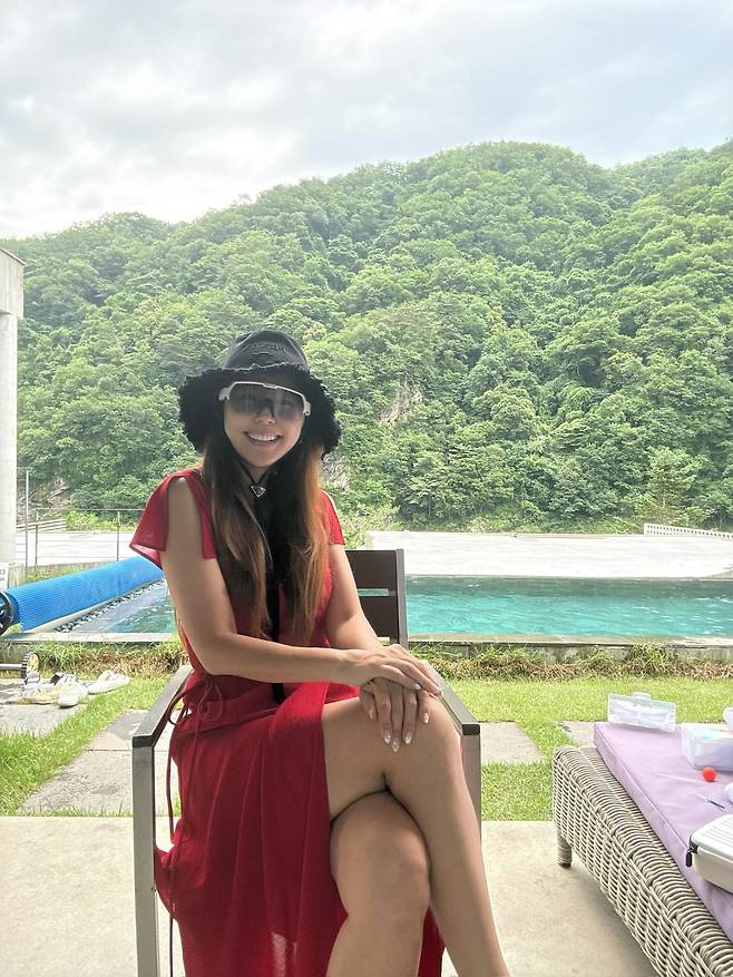 붉은빛 원피스와 블랙 버킷햇을 매치한 리조트 룩을 연출하고 있다. 랩 스타일의 붉은색 원피스는 여성스러운 실루엣을 강조하며, 선글라스와 버킷햇으로 휴양지 분위기를 완성했다. 수영장을 배경으로 한 여유로운 자세가 편안하면서도 세련된 휴가 스타일을 보여주고 있다.