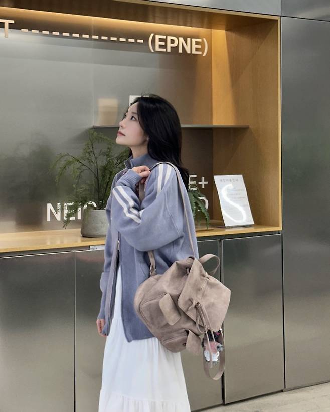 가방은 핑크 백팩으로 포인트! 전체적인 코디에 발랄함을 더하면서,