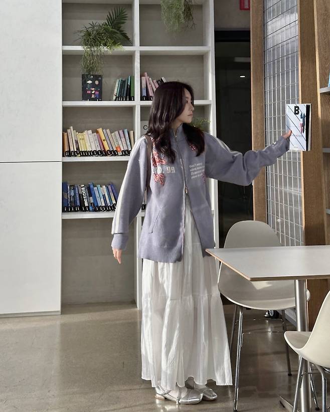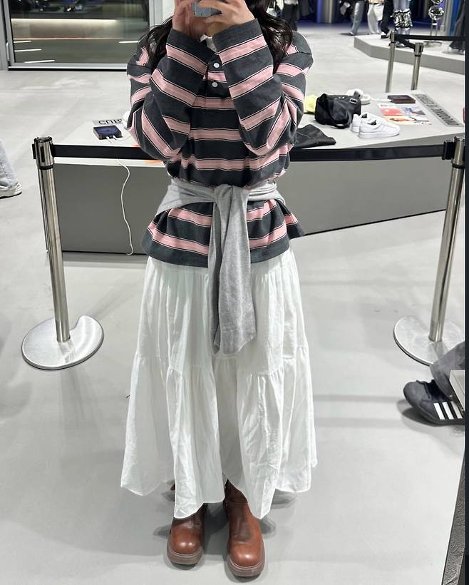 하의는 롱스커트로 매치해 체형 커버와 동시에 편안한 활동성을 챙겼습니다.