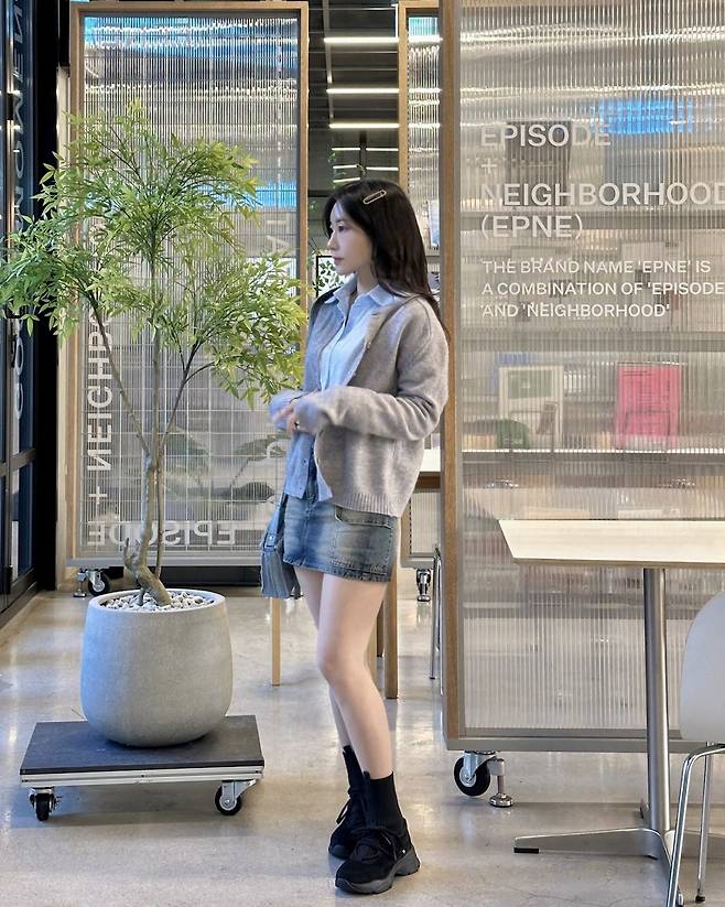 하의는 미니스커트를 매치해 답답하지 않고 경쾌한 느낌을 주었어요.