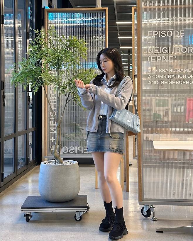 오버핏과 미니스커트의 대비가 상체는 여리여리, 하체는 발랄한 분위기를 만들어줘요.