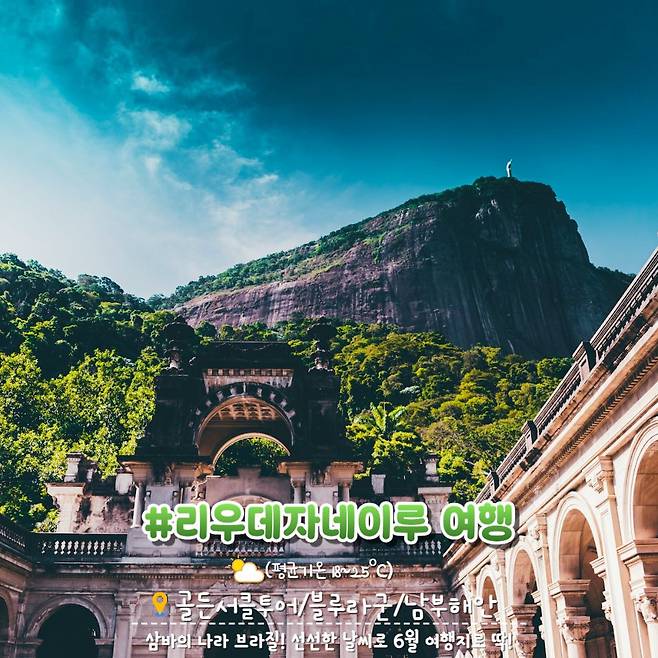 남반구에 위치한 리우데자네이루의 6월은 겨울에 해당하지만, 우리나라의 초가을 날씨와 비슷하여 가장 여행하기 쾌적한 시기입니다. 습도도 낮고 햇살이 따뜻해 해변을 즐기거나 도시를 관광하기 좋다고 할 수 있죠.