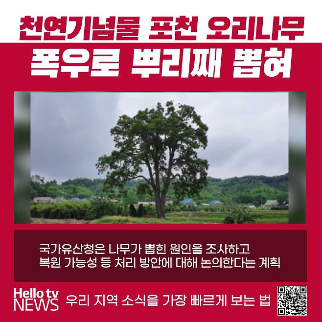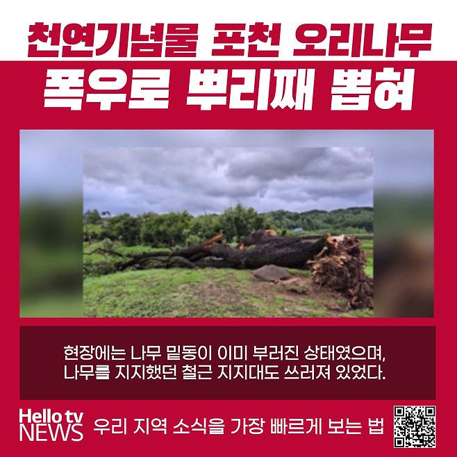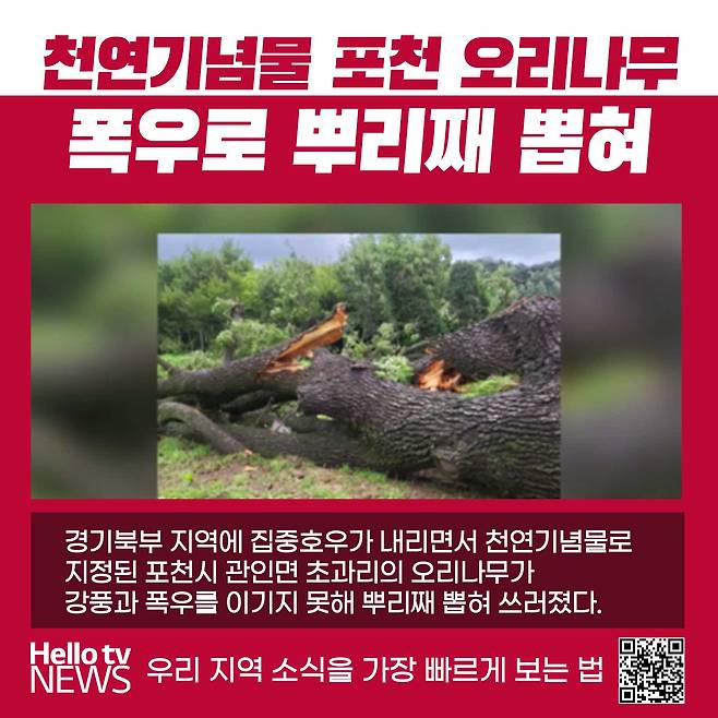 지난 23일 경기북부 지역에 집중호우가 내리면서 천연기념물로 지정된 오리나무가 뽑히는 사고가 발생했다.