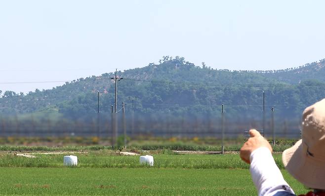 | ▲ 북한이 우리 군의 대북 확성기 방송 중지에 호응해 대남 소음 방송을 멈춘 것으로 보이는 지난 12일, 인천 강화군 송해면 당산리 주민들이 북한 개풍군 야산에 설치된 북한 대남 방송 스피커를 가르키고 있다. |