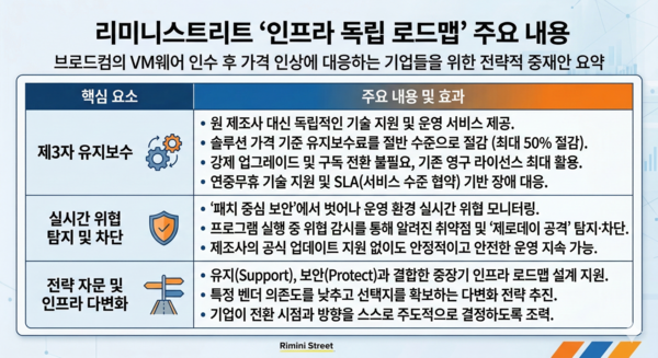 리미니스트리트가 제시하는 접근법의 핵심은 VM웨어 환경을 당장 교체하기보다 안정적으로 유지하면서 전환 전략을 준비할 시간을 확보하는 것이다. 이를 위해 회사는 VM웨어의 vSphere, ESXi, vCenter 같은 가상화 플랫폼에 대해 공식 벤더 대신 기술 지원을 제공하는 제3자 유지보수 서비스를 운영하고 있다.