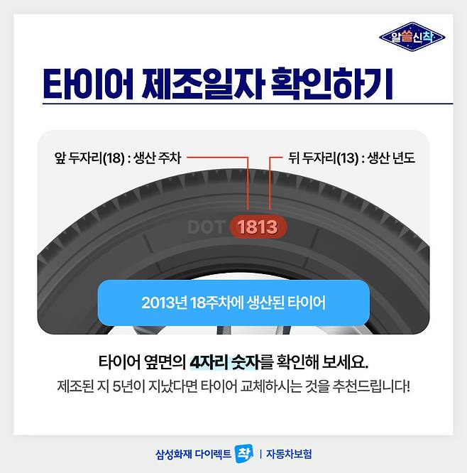 제조일자는 타이어의 옆면에서 확인할 수 있습니다. 타이어의 옆면에는 4자리의 숫자가 쓰여있는데요. 4자리 숫자 중 2자리는 생산 주차, 뒤 2자리는 생산연도를 말합니다. 예를 들어 1813의 경우 2013년 18번째 주차에 생산되었다는 뜻입니다. 이 경우 타이어가 제조된 지 10년이 넘었으니 필수로 교체해 주셔야 합니다.