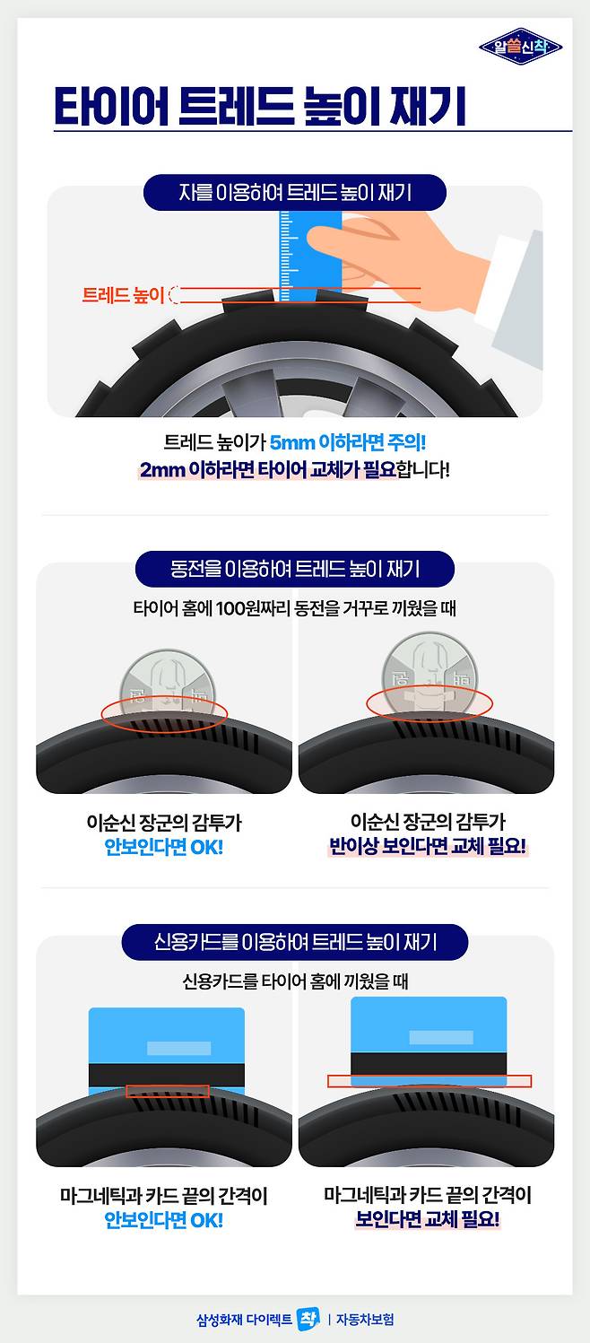 정확하게 수치를 재기 힘든 분들께는 동전을 이용하는 방법도 추천드립니다. 100원짜리 동전을 이용해서 트레드의 높이를 유추할 수 있기 때문인데요. 타이어 홈에 100원짜리 동전을 끼웠을 때 이순신 장군의 감투가 보이지 않는다면 아직 타이어의 수명이 남았다는 뜻입니다. 만약 감투의 끝부분이 보이면 타이어를 교체해야 할 시기라고 하니 이 점 참고하세요!