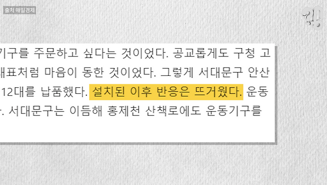 이 업체의 야외 운동기구는 서울 서대문구에 처음 설치됐는데 당시 주민들의 반응은 말 그대로 폭발적이었다고 한다. “우리 동네에는 왜 없냐”는 입소문을 타고 주변 지자체를 넘어 전국 곳곳으로 퍼져나가기 시작했다. 시장이 커지면서 경쟁업체들이 뛰어들어 지금은 무려 100여 곳의 기업이 운동기구를 생산, 납품 중이다.