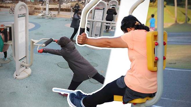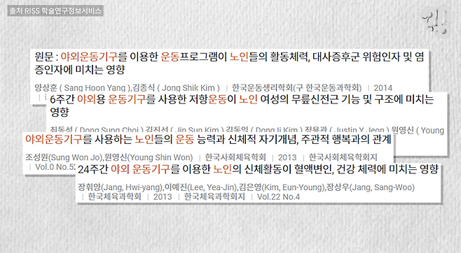 야외 운동기구를 주로 찾는 이용자는 건강을 챙기는 50~60대 중장년층과 노인층이다. 노인들이 야외 운동기구를 사용하면 건강이 얼마나 좋아지는지 연구한 논문이 이렇게 많을 정도. 공원 운동기구만 열심히 써도 근력과 유연성이 강화되고 노화를 지연시키는 효과가 생긴다고 하니 어르신들에겐 이곳이 헬스장이고 필라테스 교실인 셈.