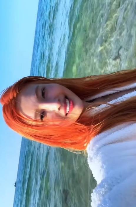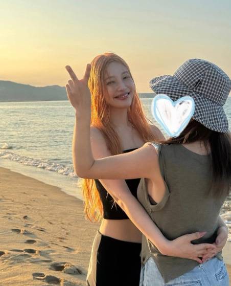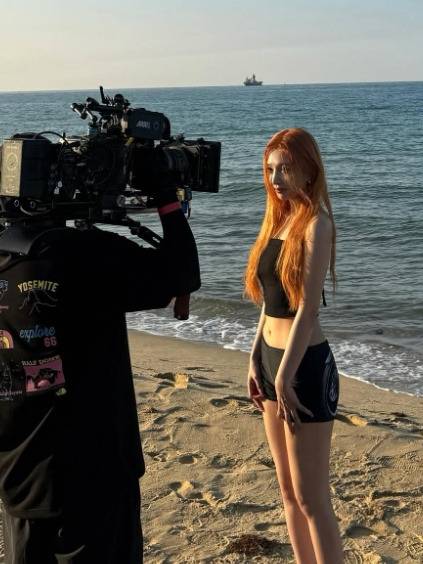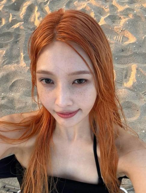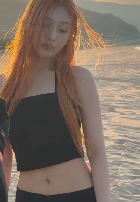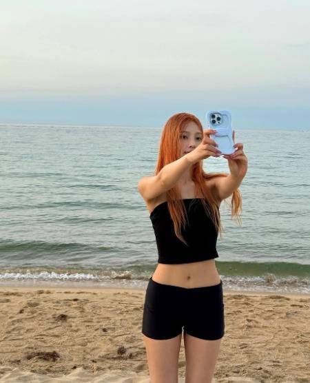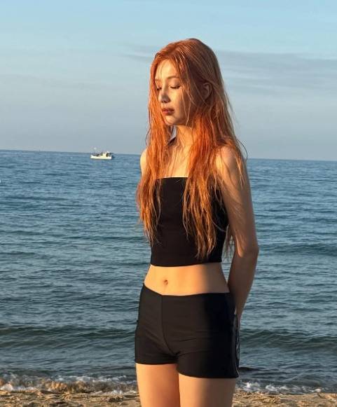 이번 사진에서 조이는 블랙 튜브탑 민소매 상의와 블랙 핏 쇼츠를 매치하여 시크하면서도 세련된 바다룩을 선보였습니다. 오렌지빛으로 물든 스트레이트 헤어는 몽환적인 분위기를 더했죠.