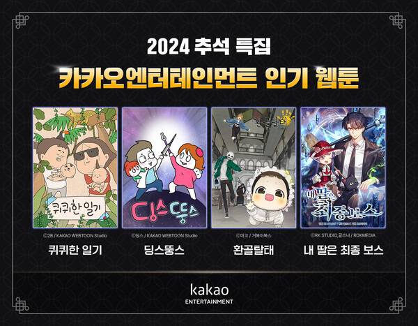 카카오엔터테인먼트가 추석 명절을 맞아 웹툰 추천작 4개 작품을 추천했다. △퀴퀴한 일기 △딩스뚱스 △환골탈태 △내 딸은 최종 보스 등이다. 카카오엔터는 가족과 함께 보기 좋은 이야기를 갖춘 작품이라고 설명했다.