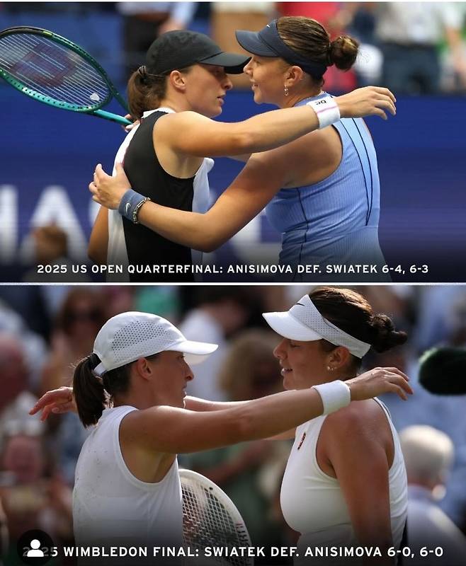 불과 53일 전 2025 윔블던 여자단식 결승에서 이가 시비옹테크(24·폴란드)한테 0-6, 0-6 패배(더블 베이글) 굴욕을 당했던 아만다 아니시모바(24·미국). 세계랭킹 9위인 그가 3일 여자단식 8강전에서 2위 시비옹테크를 6-4, 6-3으로 완파하고 4강에 오른 것입니다.