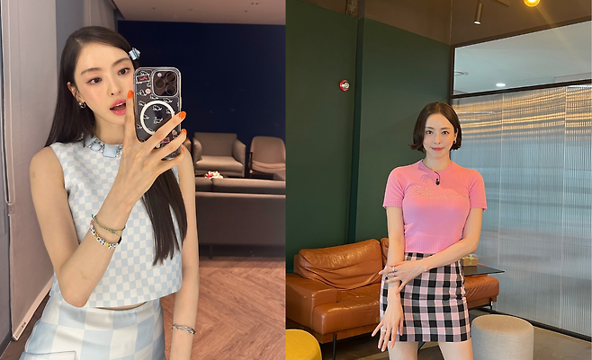 하늘색 체크 패턴 크롭탑과 화이트 미니스커트로 상큼한 여름 룩을 선보이고 있다. 톤다운된 파스텔 체크 패턴으로 과하지 않은 포인트를 주었으며, 실버 액세서리와 네일 포인트로 디테일을 살렸다. 셀카 포즈와 함께 자연스러운 일상 패션의 매력을 드러내고 있다.