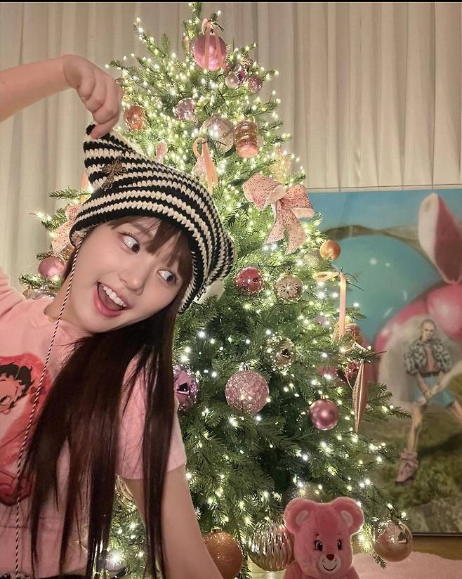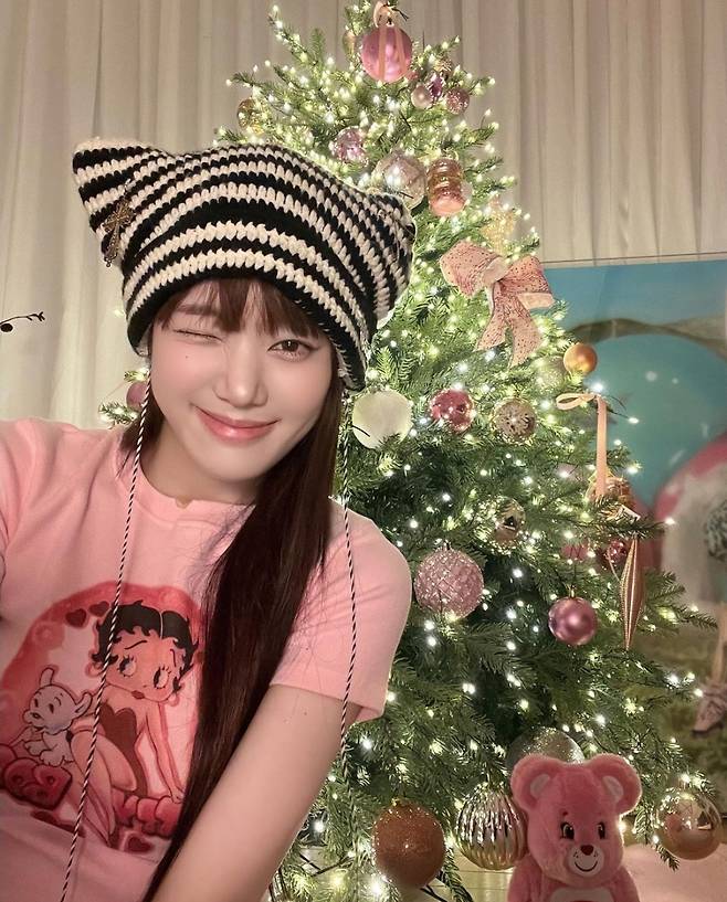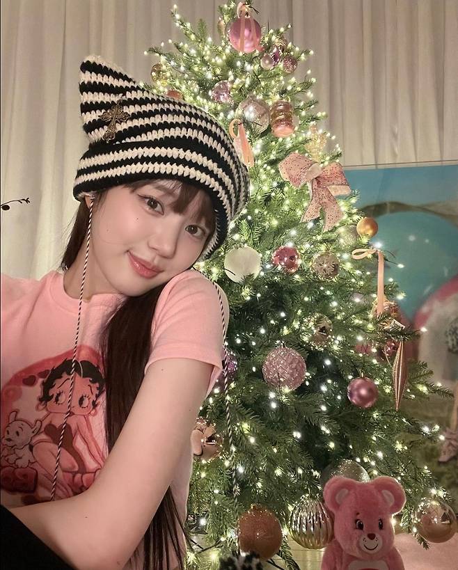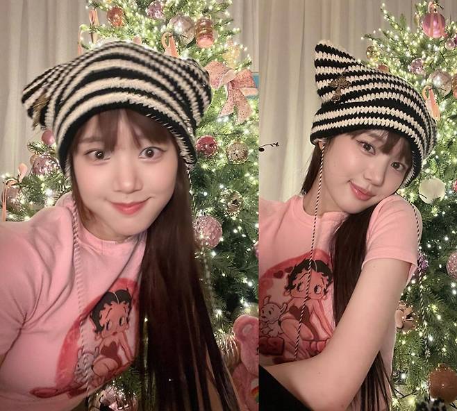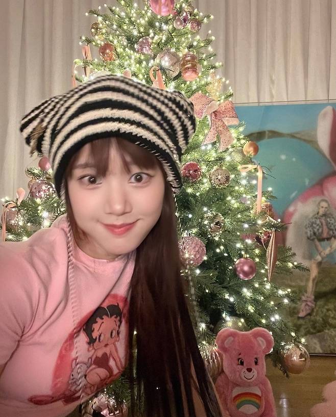 이유비는 핑크 크롭 티셔츠를 착용해 사랑스러운 미모를 뽐냈습니다. 특히 이유비는 스트라이프 패턴의 배색 비니를 착용해 귀여운 악동 같은 이미지를 보였습니다. 이와 함께 이유비는 핑크색 오너먼트로 장식된 트리 옆에서 행복한 모습을 공개해 보는 이들이 미소 짓게 했습니다.