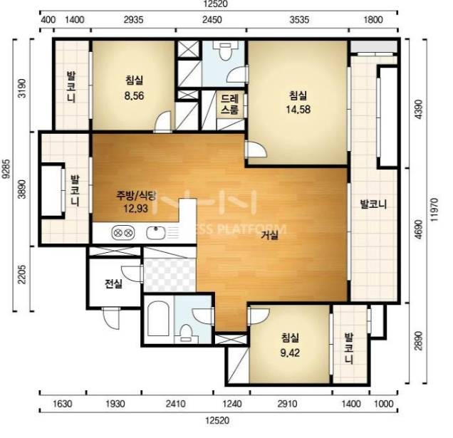 제 도면(?)이랑 비슷하죠? ㅎㅎ 약간의 구조변경으로 주방과 현관이 커지며 각각의 독립적인 공간이 생겼어요.